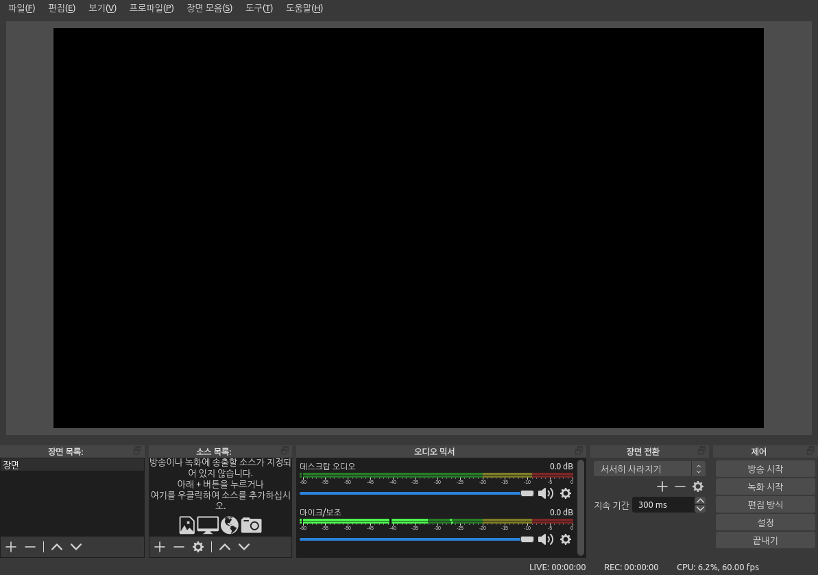 프로그램을 실행시키면 비디오, 오디오 장치를 추가하여 연동할 수 있는 기능과 현재 화면을 동영상으로 녹화를 하거나 방송을 할 수 있는 설정기능이 나타납니다.