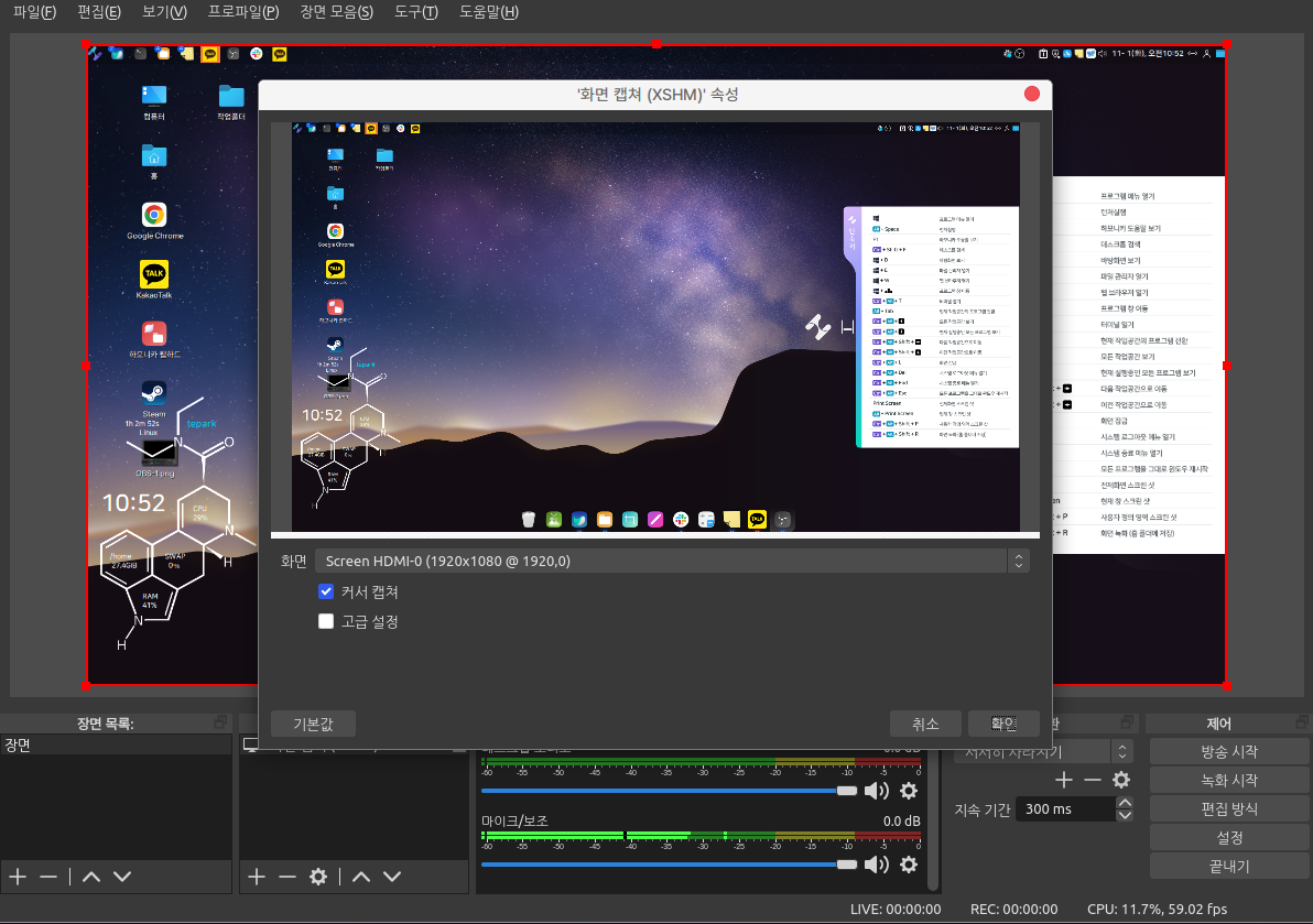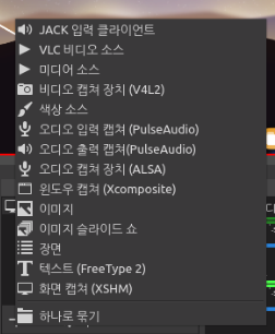 실행화면 하단의 '소스목록'에서 '+' 버튼을 눌러 '화면캡처' 를 추가하여 현재 PC화면을 동영상으로 녹화할 수 있습니다.