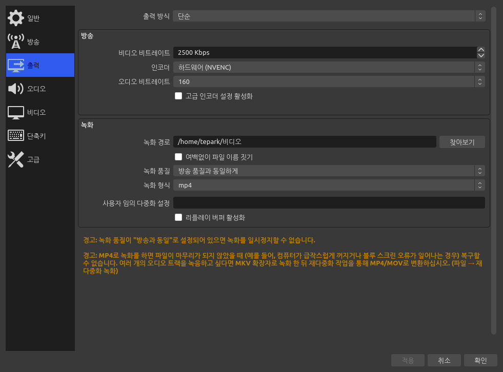 우측하단에 설정 기능에서는 일반설정, 방송 스트림 설정, 동영상파일 저장 경로, 오디오/비디오 장치 설정, 단축키 등을 제공합니다.