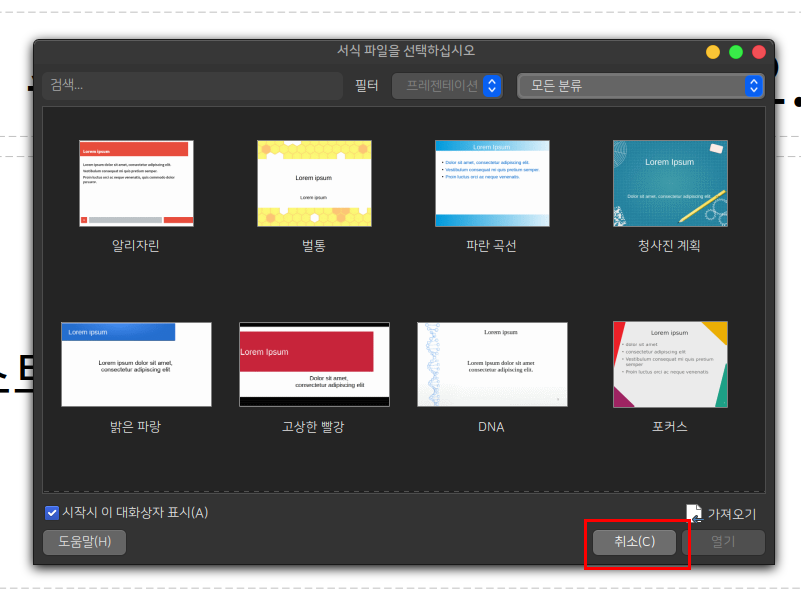 - 빈 프레젠테이션을 생성하고 싶으면 서식 팝업창에서 [취소]를 선택하세요.