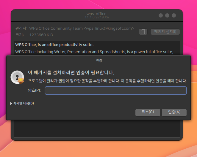 패키지를 설치 할 경우 아래와 같은 인증창이 나오면 하모니카OS를 설치할때 입력했던 사용자 비밀번호를 입력합니다.