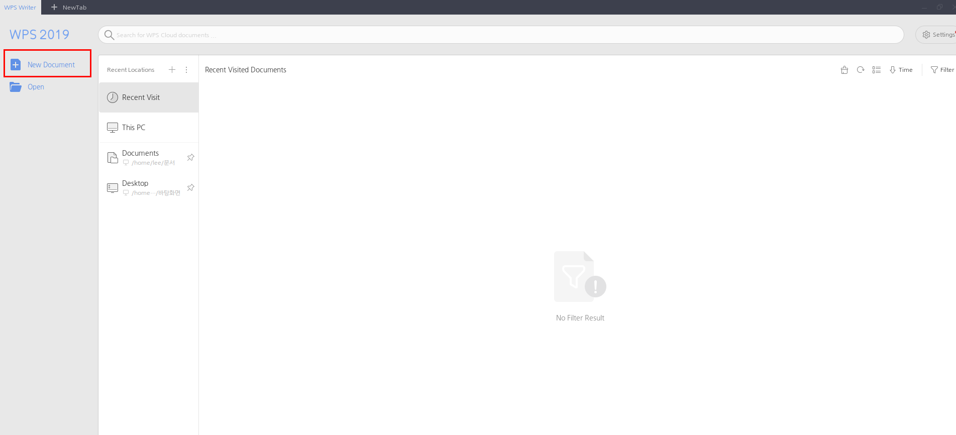 WPS Writer를 실행시키면 최근 생성한 파일 목록이 나오고