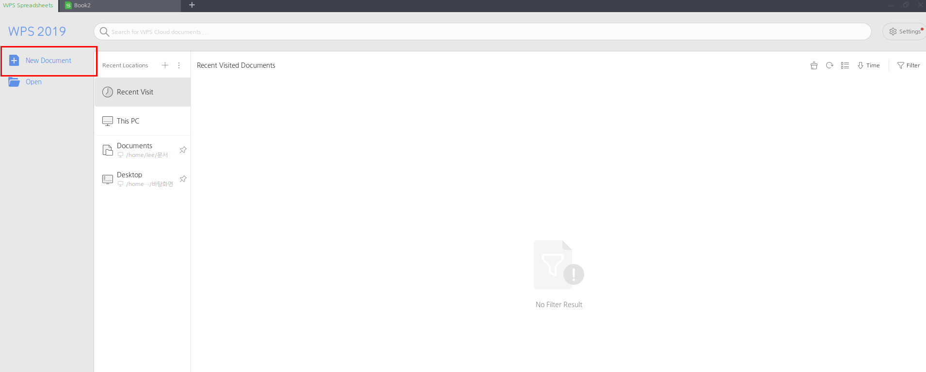 스프레드 시트 생성도 동일합니다. WPS Spreadsheet를 실행시켜 [New Document]를 클릭하면