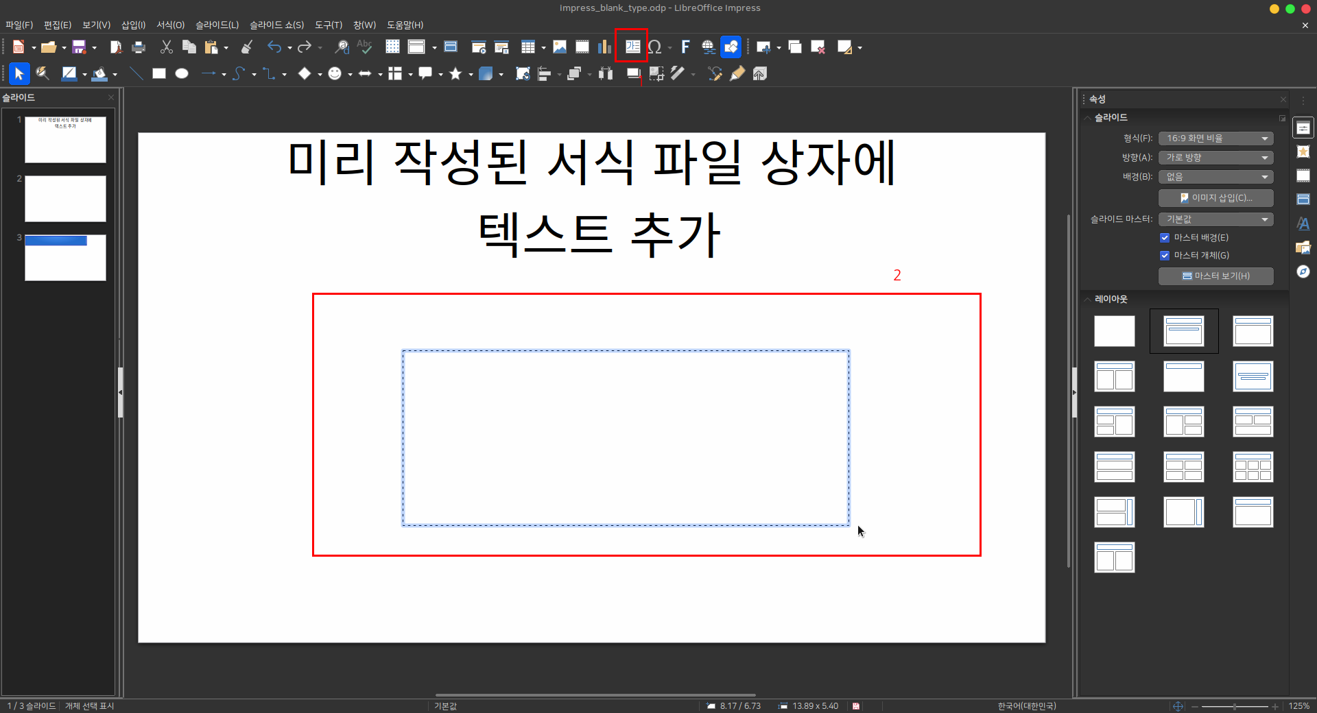 슬라이드에 텍스트를 추가하려면, 미리 작성된 서식 파일 상자를 선택하거나 삽입 > 텍스트 상자를 선택하세요.