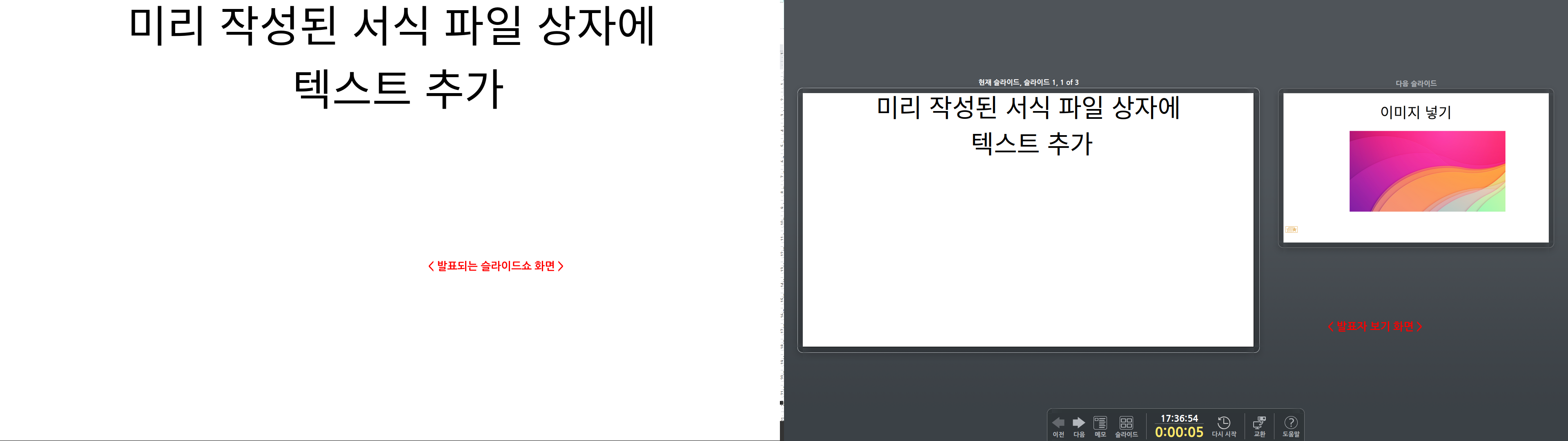 여기서는 슬라이드의 "숨겨진" 컨트롤을 사용하고, 개인적인 프레젠테이션 메모를 보고, 이를 기록할 수 있습니다.
