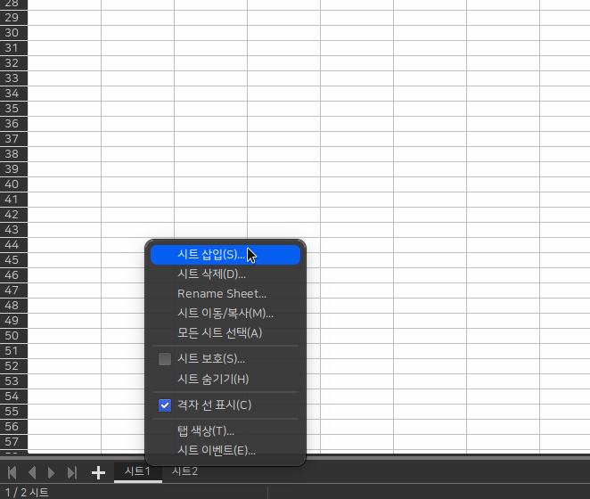 - 새 워크 시트를 기존 워크시트의 끝에 빠르게 삽입하려면 화면 맨 아래의 워크시트 삽입 탭을 클릭합니다.