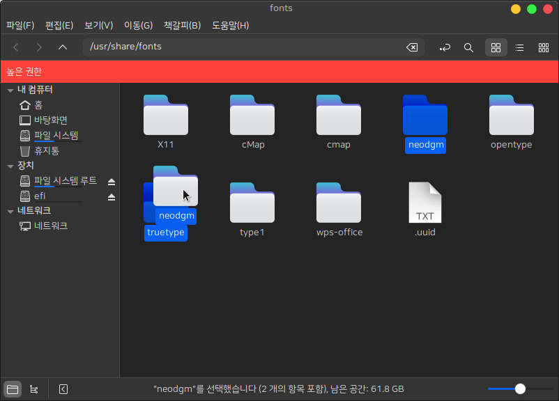 3. 마우스 우클릭을 하여 "neodgm" 폴더를 생성하고 다운받은 neodgm.ttf 파일을 해당 폴더로 옮기세요. 그리고 "neodgm" 폴더를 [ truetype ] 폴더 하위로 이동시키세요.
