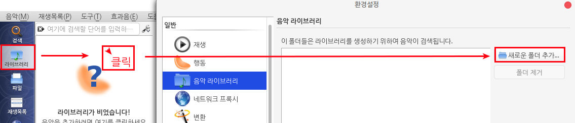 라이브러리를 탭을 클릭하여 음악 추가를 클릭하고 새로운 폴더를 추가합니다.