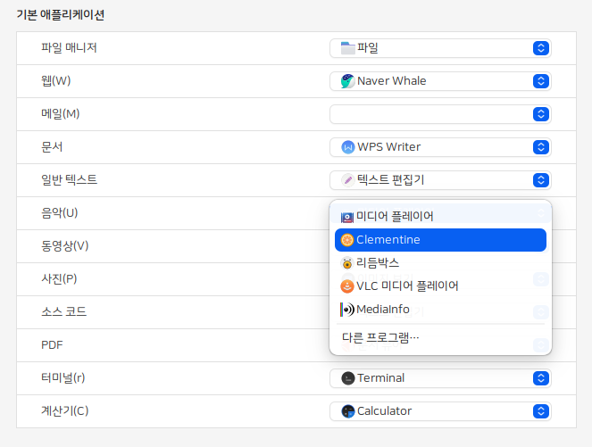 클레멘타인은 새로 설치한 음악 플레이어이기 때문에 이 프로그램을 기본 음악 플레이어로 등록해 주어야 합니다.