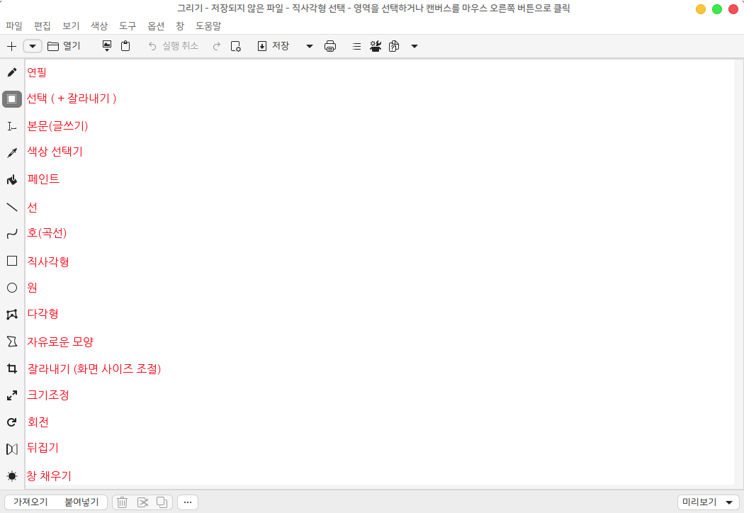 윈도우를 사용했던 사람이라면 누구나 알고있는 기본 그림판과 매우 비슷한 형태로 구성되어 있습니다.