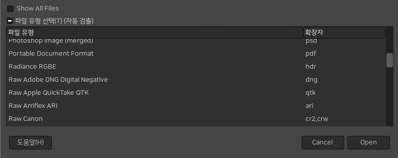 열기를 하여 하단의 파일 유형 선택을 보면 어떤 확장자를 열 수 있는지 확인 할 수 있습니다.