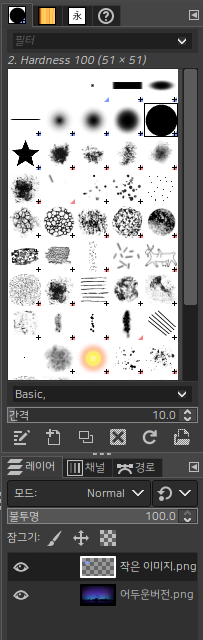 김프의 우측에는 붓, 무늬, 글꼴, 레이어 등을 설정할 수 있습니다.