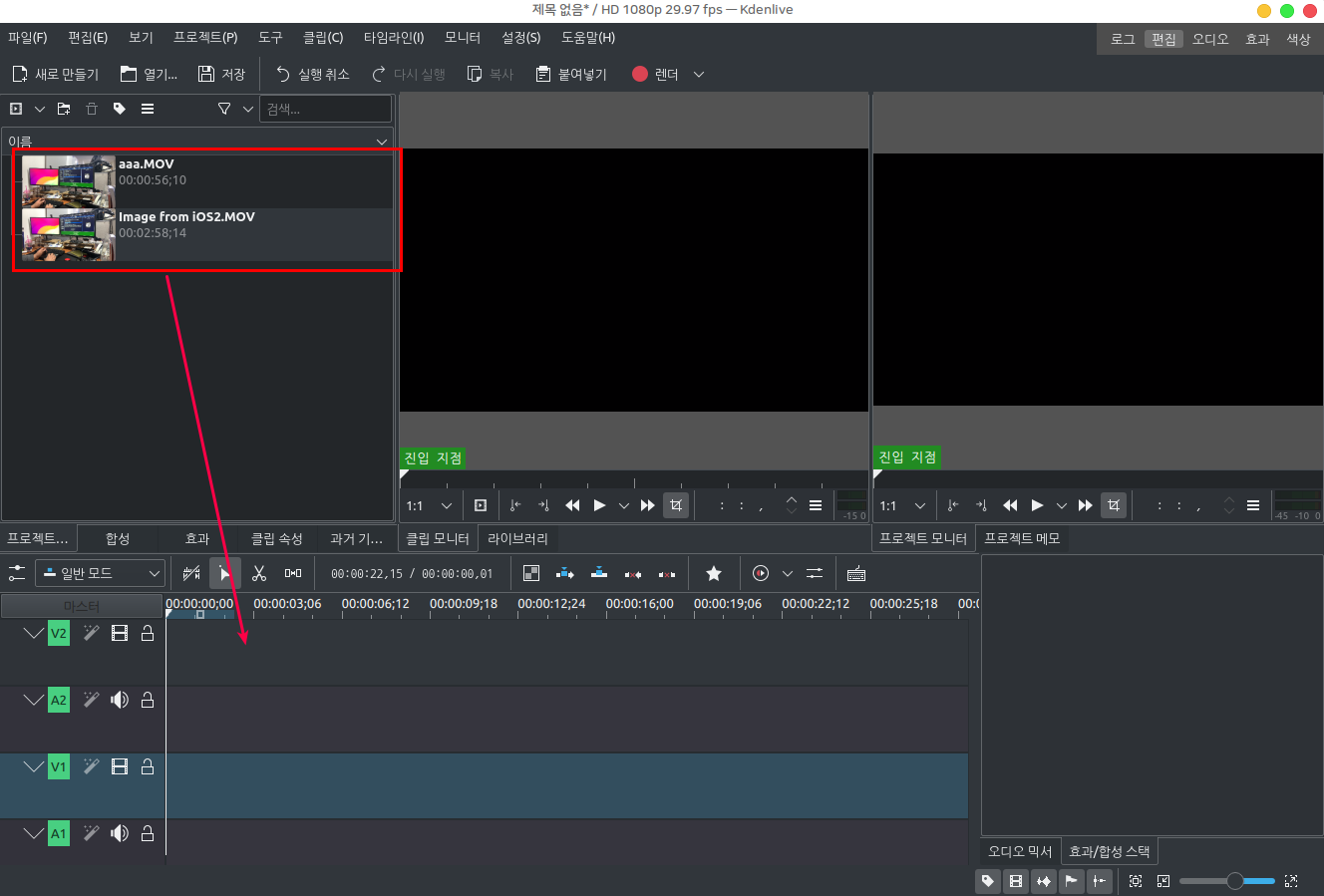 리스트에 있는 미디어 파일을 아래쪽에 끌어다 놓으면 편집을 할 수 있습니다.