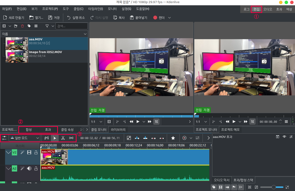 ② 합성과 효과를 이용하여 영상을 편집할 수 있습니다.
