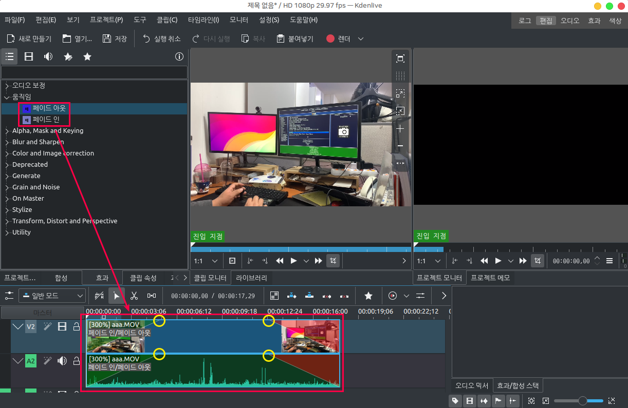 '효과 > 움직임' 에서 페이드인 & 아웃을 아래의 편집영상에 끌어다 놓습니다.