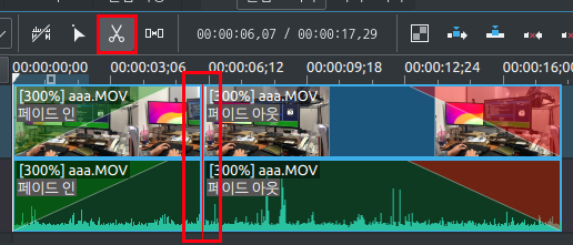 영상을 자르는 방법은 가위모양의 아이콘을 누른 후 영상에 마우스 커서를 대면 빨간색 선이 나오게 됩니다.