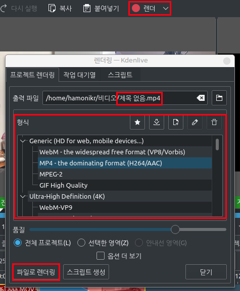 형식에서 설정한 부분으로 출력파일 이름의 뒤에 적혀있는 확장자가 정해집니다.