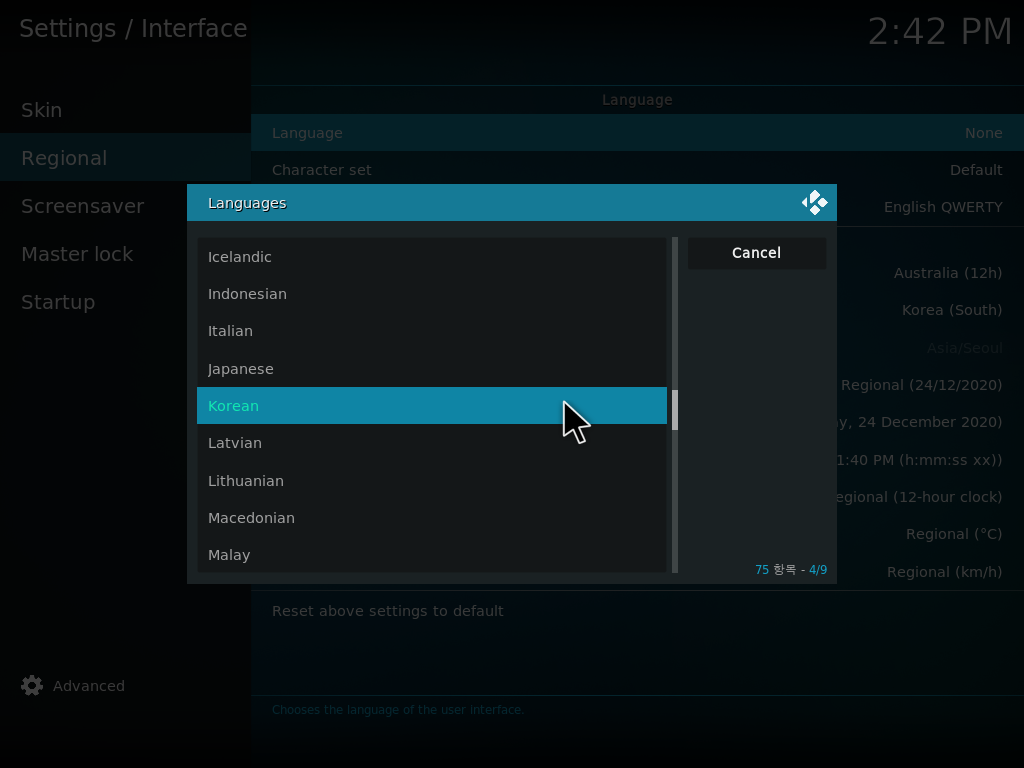 우측의 Language(언어)를 Korean으로 설정합니다. (한국어 팩을 다운로드 받습니다.)