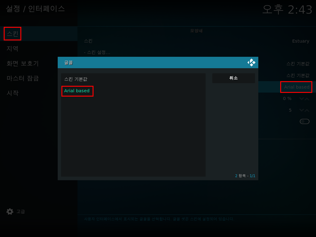 만약 Language(언어)를 Korean으로 설정하였는데 글씨가 ㅁ 형태로 깨져서 보인다면 Skin(스킨) 항목에서 Fonts(글꼴)을 선택하여 Arial based로 변경합니다.