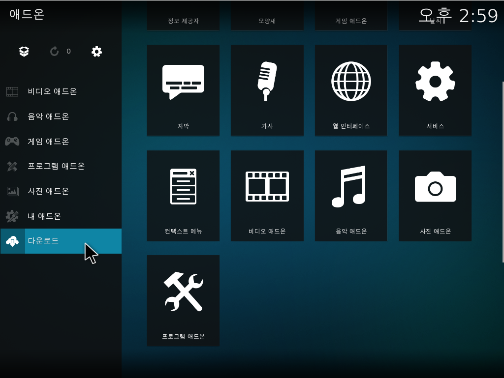 다운로드에는 코디에서 지원하는 여러 애드온이 존재하는데 그 중 비디오 애드온을 설치해 보겠습니다.