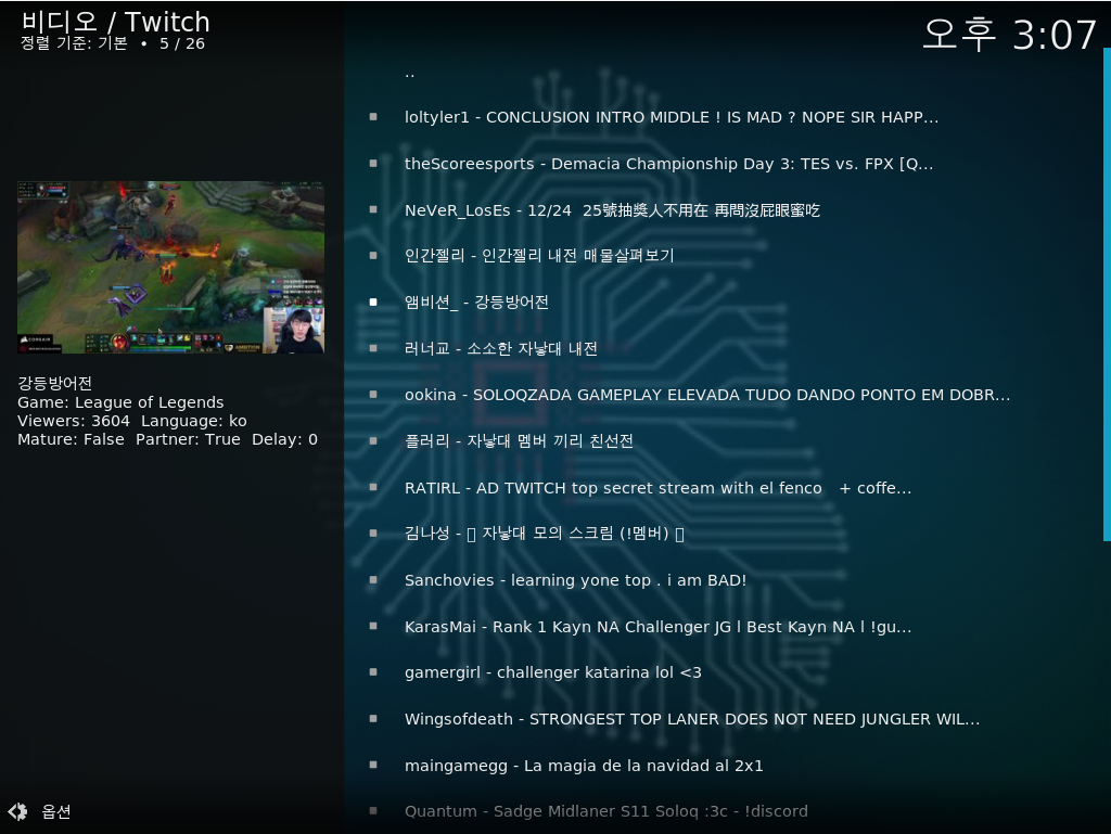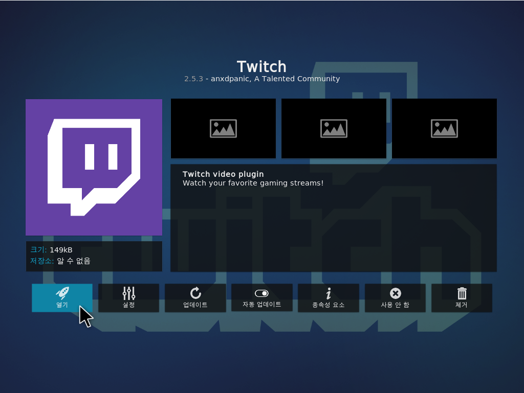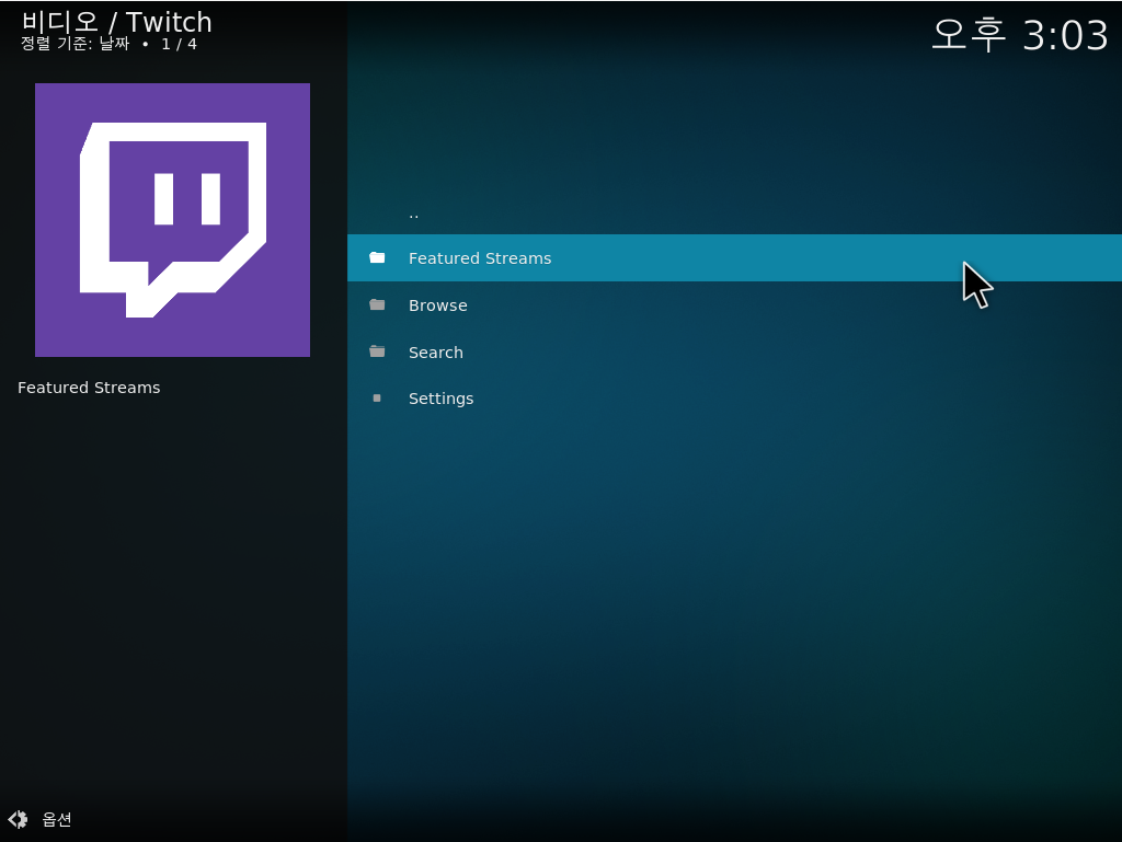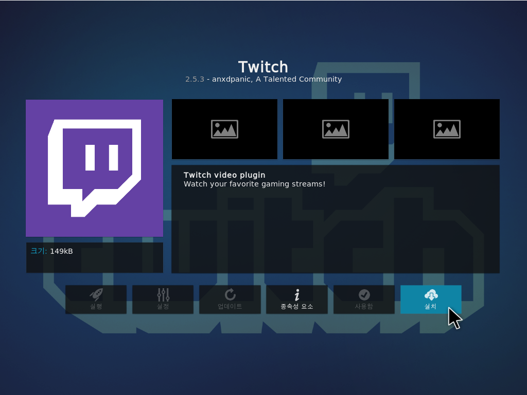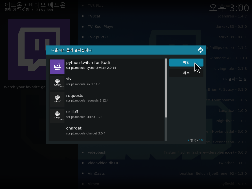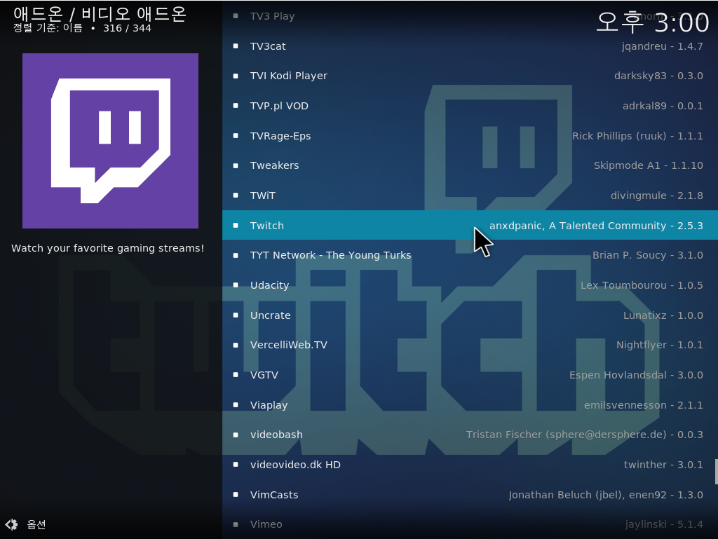 비디오 애드온 중 Twitch 애드온을 설치해 보겠습니다.