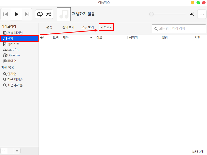 좌측의 '음악' 으로 이동 후 가져오기 버튼을 눌러줍니다.