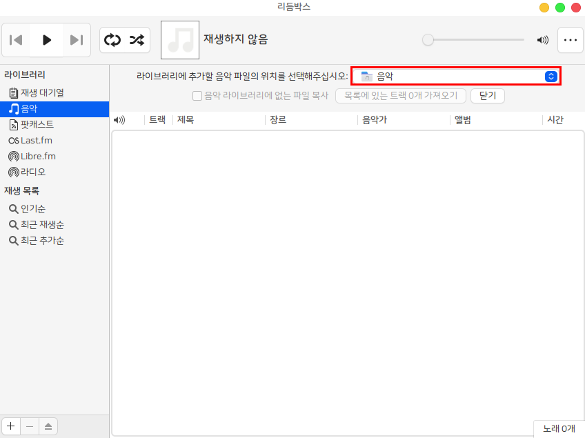 클릭하여 음악이 있는 폴더의 경로를 직접 선택할 수 있으며 음악 폴더를 그대로 사용하고 싶다면 가지고 있는 음악들을 음악폴더로 이동하면 됩니다.