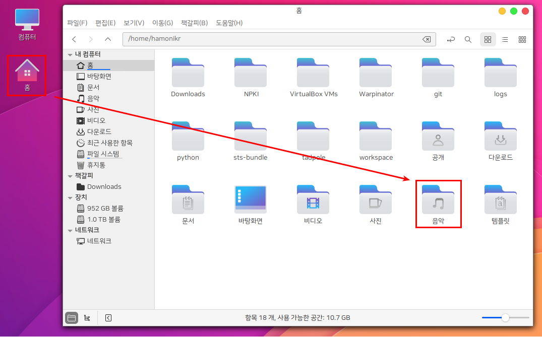 음악 폴더는 바탕화면의 '홈 > 음악'  경로에 있습니다.