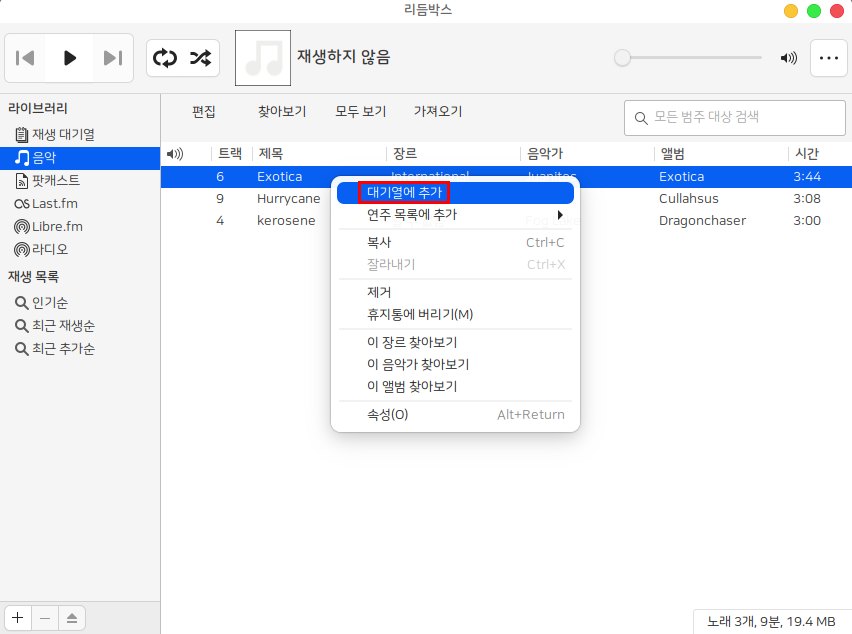 등록된 트랙 목록을 우클릭하여 '재생 대기열'에 추가할 수 있습니다.