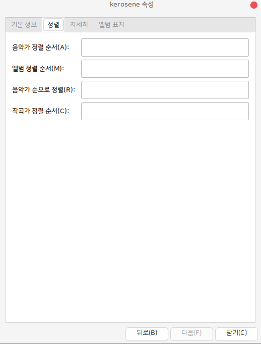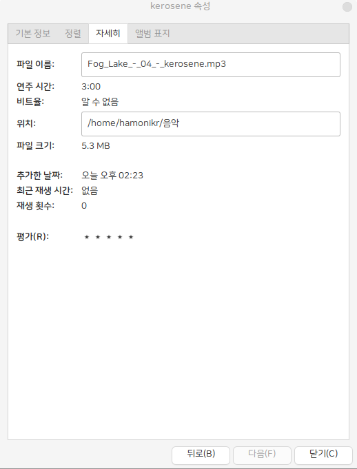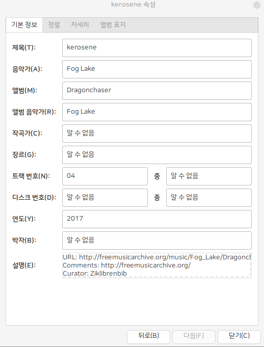 하단의 '뒤로', '다음' 버튼으로 다른 음악파일의 정보를 확인할 수 있습니다.