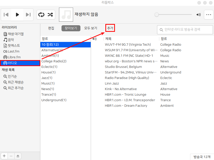 좌측의 '라디오' 선택 후 '추가' 버튼을 누릅니다.