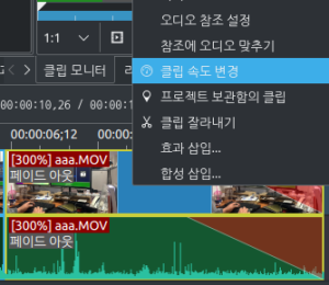 잘라내기로 자른 영상을 우클릭하여 '클립 속도 변경'을 통해 영상의 속도를 조절할 수 있습니다.