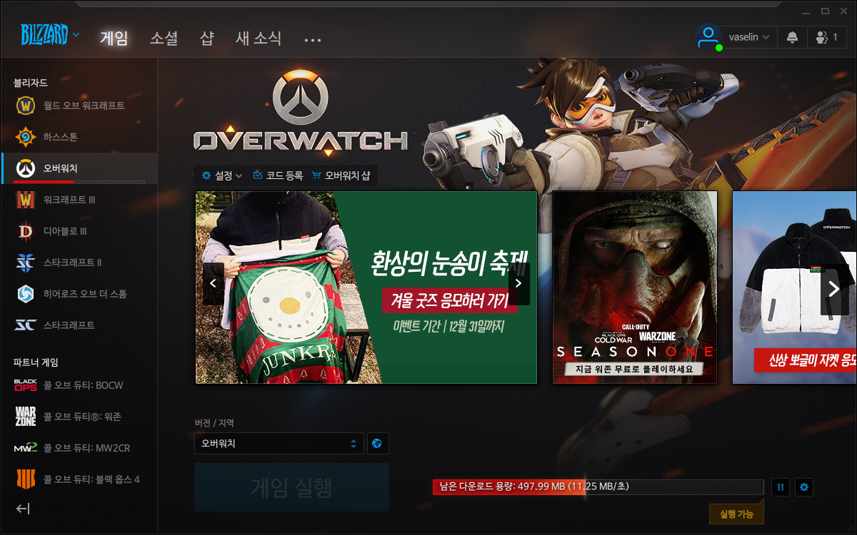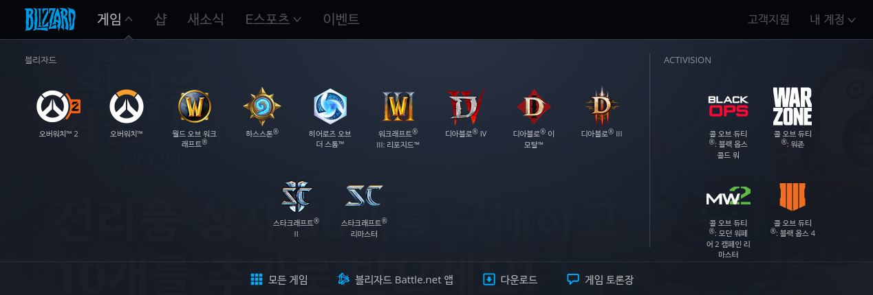 배틀넷 런처를 실행하면 플레이할 수 있는 게임 목록이 나타나며 좌측의 게임 목록을 선택하면 이전에 구매 했던 게임을 설치할 수 있습니다.