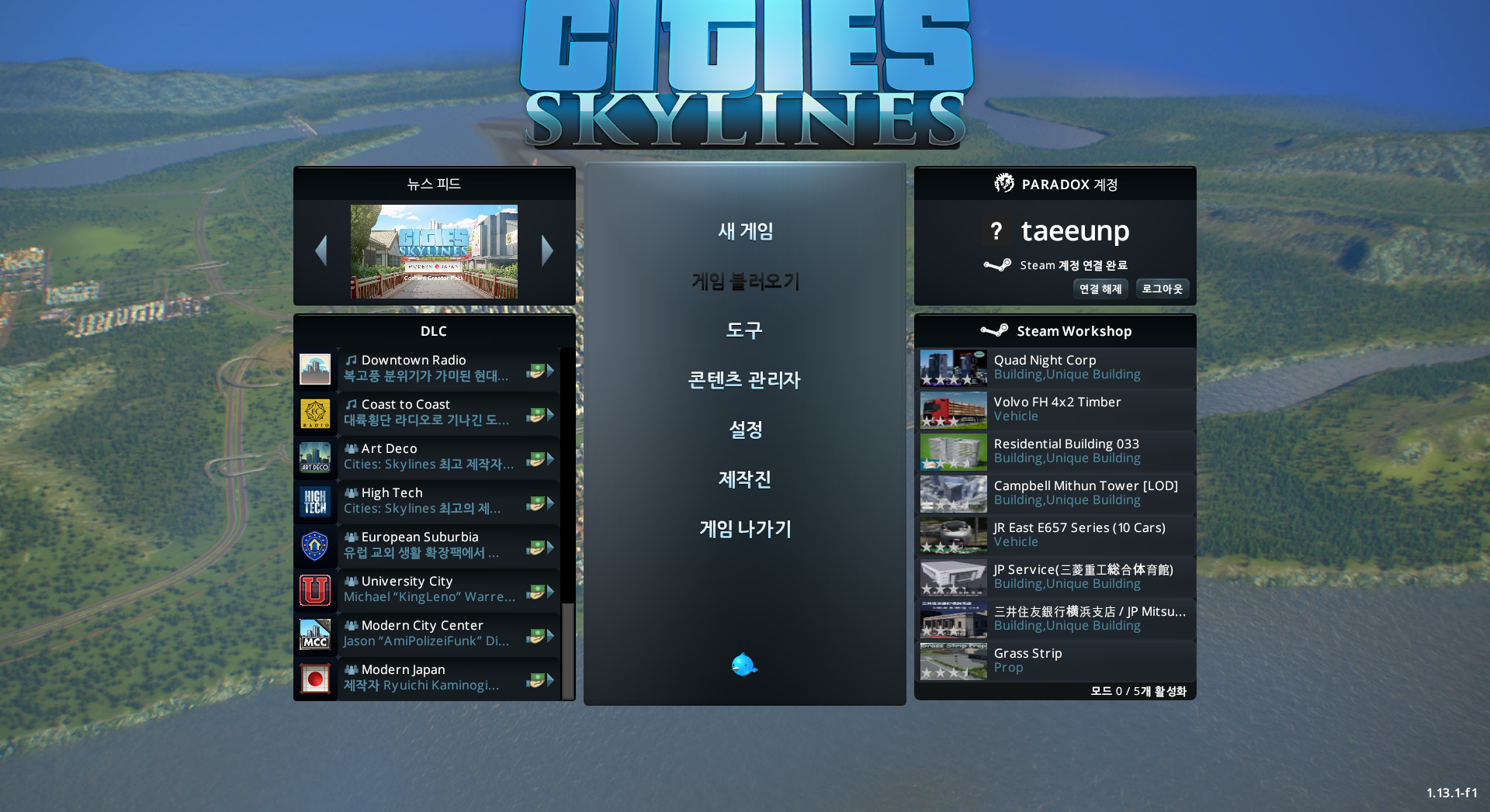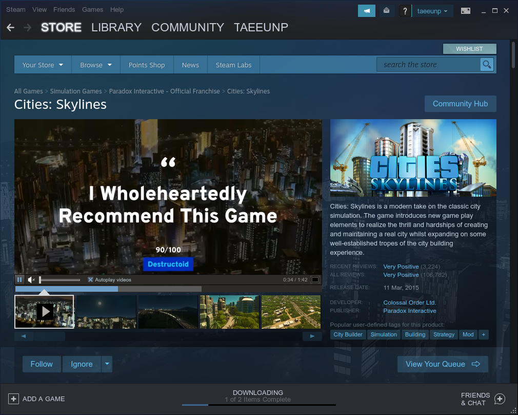 스팀을 실행하여 시티즈 스카이라인(Cities Skyline)를 검색합니다.