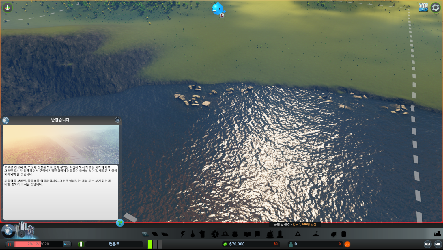 생성된 지도에서 원하는 구역을 선택하여 도로와 하수도를 건설하여 주민들이 이사오도록 하면 도시가 생성되고 점점 발전합니다.
