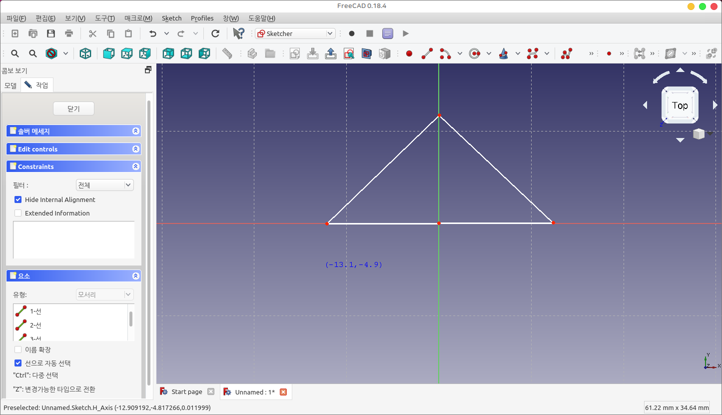 Sketcher를 선택하여 새로 만들어진 공간에 직선도구로 삼각형을 만들어 줍니다.