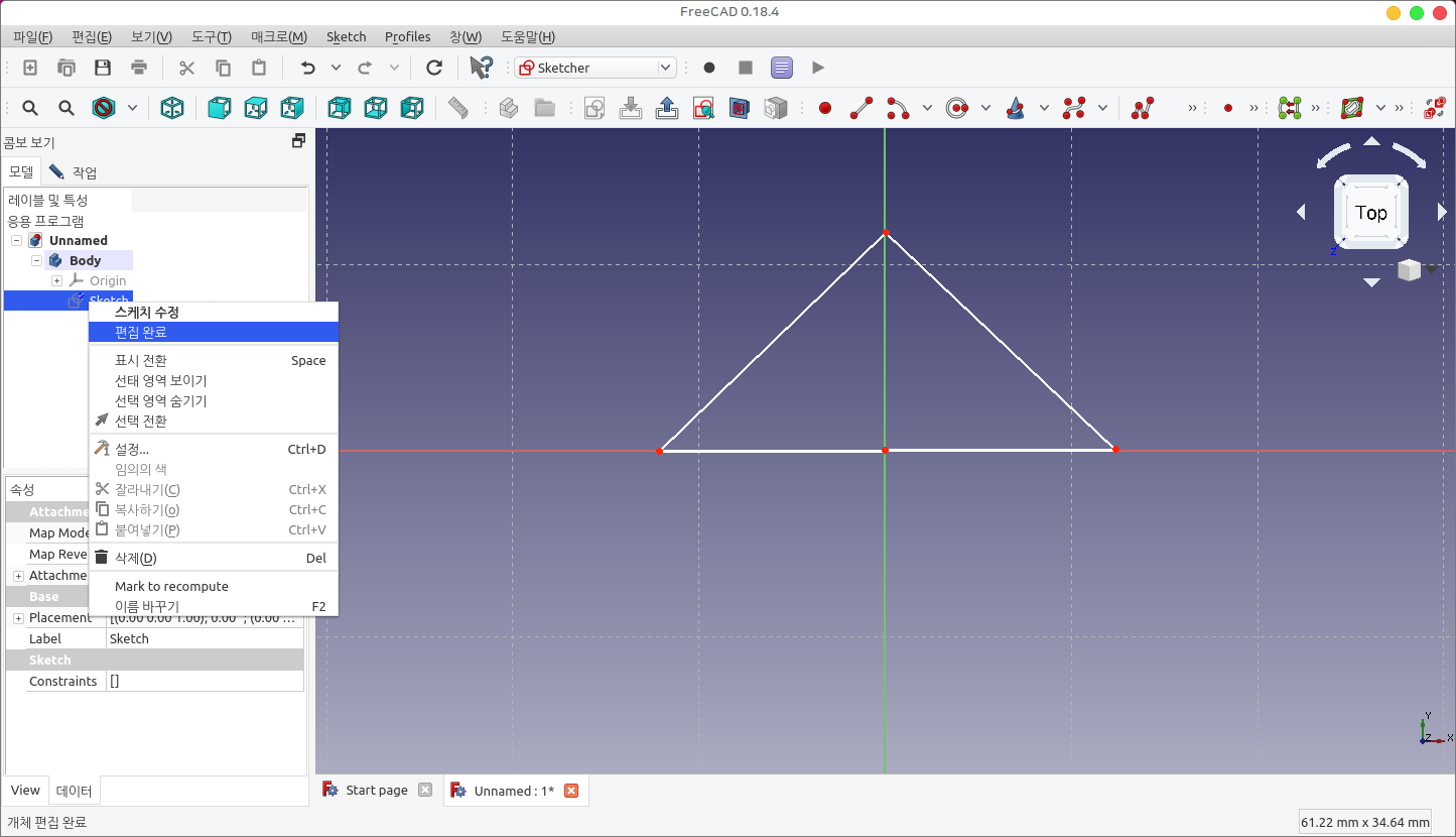 삼각형이 완성되면 좌측 작업메뉴의 Sketch에서 편집을 완료합니다.