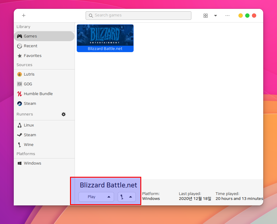 Lutris에 설치된 배틀넷 런처를 선택하면 하단에 실행할 수 있는 버튼이 생성됩니다. Play를 선택하여 배틀넷 런처를 실행합니다.
