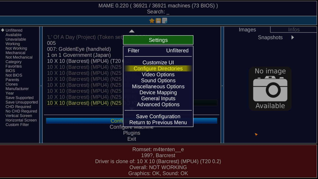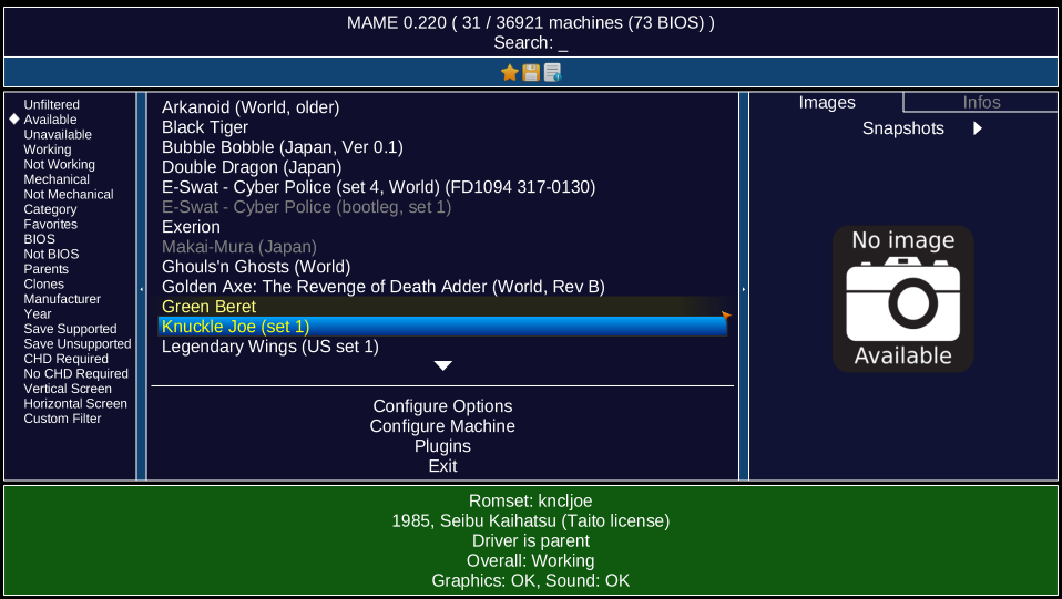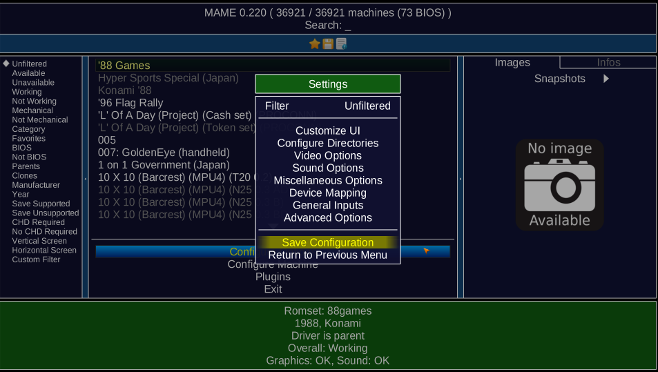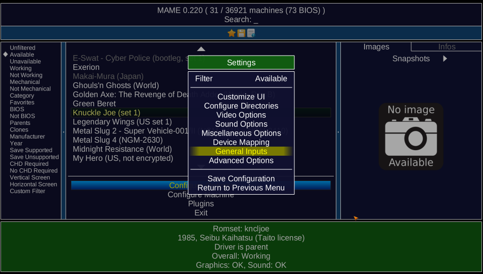 저장 이후에 좌측메뉴 Available을 선택하면 새롭게 roms 디렉토리를 만들어 복사한 경로에 플레이가능한 게임 목록을 불러옵니다.