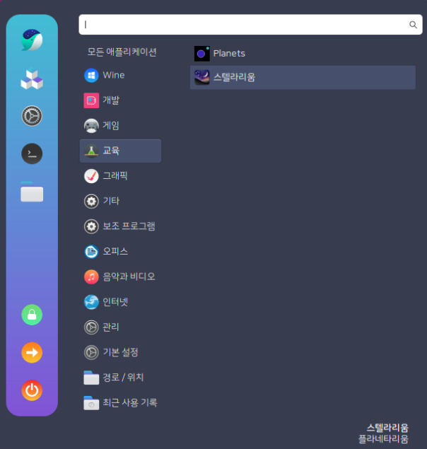 설치가 완료되면 시작 메뉴에 '교육' 카테고리가 생기며 그 하위에 스텔라리움 메뉴가 나타납니다.