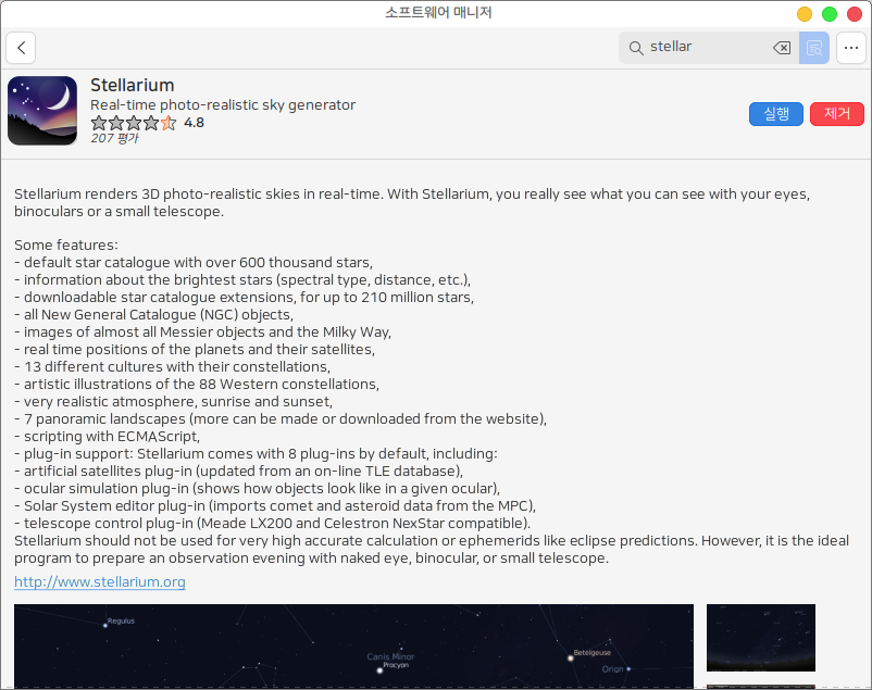 하모니카OS의 소프트웨어 매니저에서 Stellarium으로 검색하여 프로그램을 설치합니다.