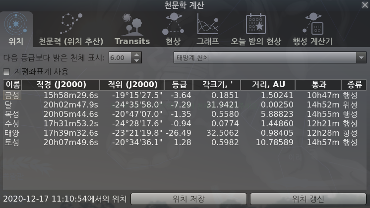 좌측메뉴 아래쪽에 동그란 시계모양의 아이콘을 클릭하면 천문학 계산창이 생성됩니다.