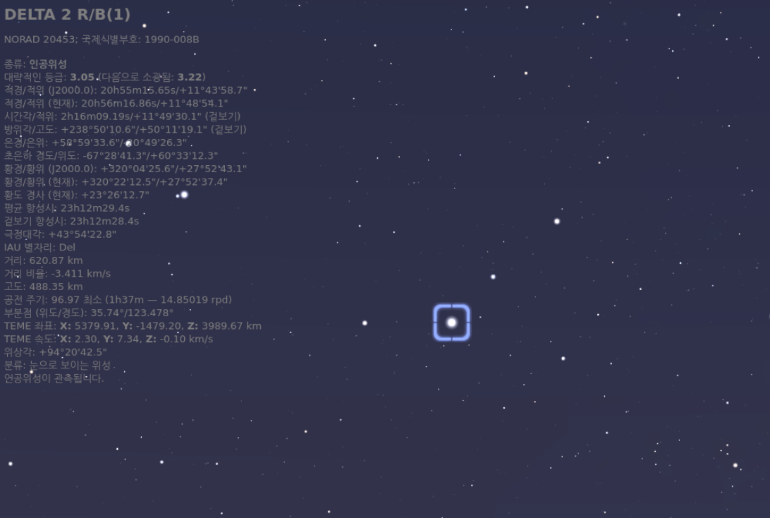별자리를 관측하던 중 남서쪽 하늘을 재빠르게 가로질러 가는 별이 있어서 혜성인가 하여 마우스를 클릭하여 정보를 보니 인공위성 이었습니다.