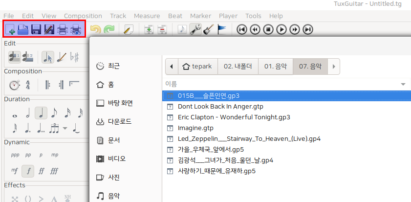 Guitar Pro에서 제작한 확장자가 gp, gp3, gp4, gp5 등의 파일도 TuxGuitar에서 재생이 가능합니다.