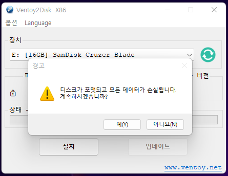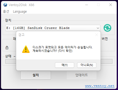 설치 버튼을 누르면 다음과 같이 USB가 초기화 된다는 경고 메세지가 나오게 되는데 확인을 눌러 주시면 됩니다.