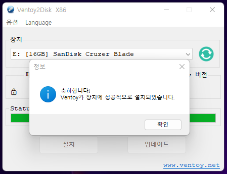 설치가 완료되면 다음과 같이 완료 메세지가 나오고 확인을 누른 후 Ventoy 프로그램을 종료 합니다.
