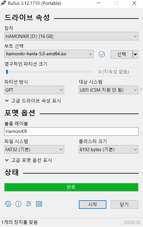 작업이 끝나면 이미지 하단의 상태 부분의 막대가 초록색으로 되고 시작과 닫기 버튼이 활성화 됩니다.