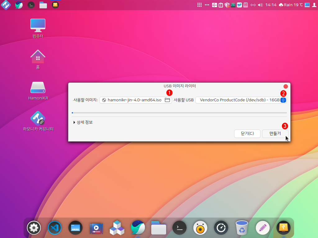 하모니카 OS에서는 별 다른 프로그램 없이 부팅 USB를 만들 수 있습니다.