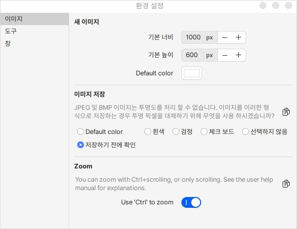 환경 설정을 통해 기본 이미지의 크기를 지정하거나 도구 추가, 테마 등을 변경할 수 있습니다.