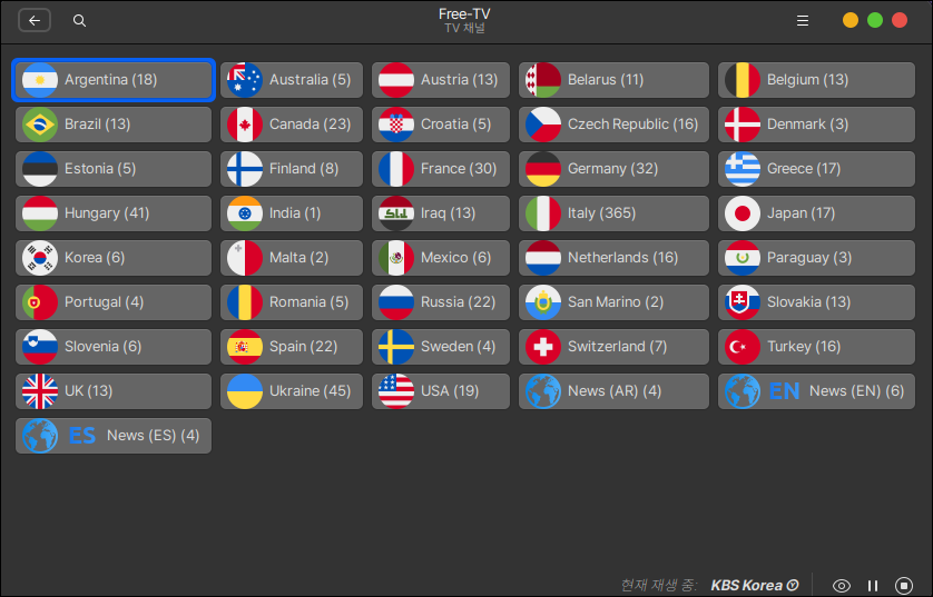 국가를 선택 후 첫 화면 왼쪽 TV 아이콘을 클릭하면 시청이 가능한 국가별 TV채널 목록이 나타납니다.